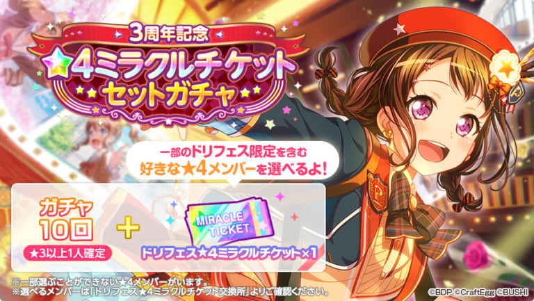 【バンドリ!ガルパ】ドリフェス限定(一部)を含む★4メンバーから好きな1人を選べる!「3周年記念★4ミラクルチケットセットガチャ」開催!