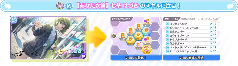 【あなた次第】七草 はづきはVisualアピールを得意とするアイドルの育成支援に特化したサポートキャラクターです。