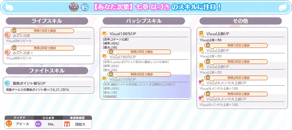 特訓3回目で解放されるライブスキル「あなた次第+」はVisual6倍アピールを行うことができます。