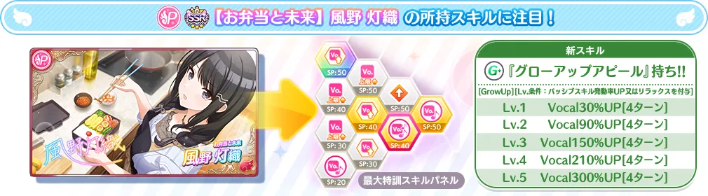 さらに、グローアップアピールで「パッシブスキル発動率UP又はリラックスを付与」を条件にLv.UPし、Lv.5ではVocal300%UPを付与することができます。
