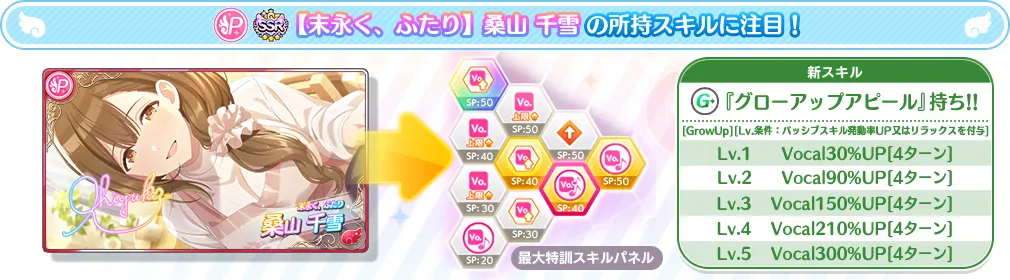 スキルパネルから「桑山 千雪のアピール値を+50%UP」の強力な固有アビリティを習得可能となっています。