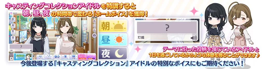 さらにテーマに沿った役柄を演じているアイドルと1日を通じて過ごしているかのような体感を得ることができる特別な「ホームボイス」も登場!!