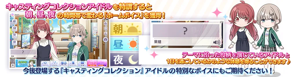 さらにテーマに沿った役柄を演じているアイドルと1日を通じて過ごしているかのような体感を得ることができる特別な「ホームボイス」も登場!!