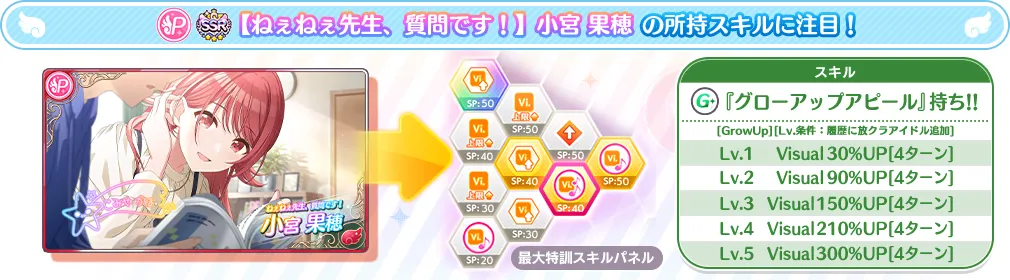 【ねぇねぇ先生、質問です!】小宮 果穂のスキルパネルは強力な効果を持つ虹色のパッシブスキルが配置されており特訓4回目で解放されます。