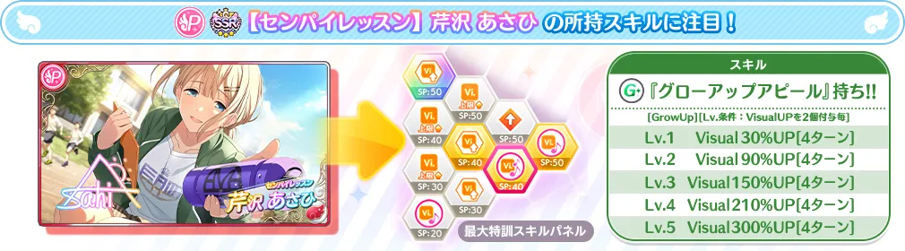 さらに、Plusアピールで「芹沢 あさひがライブに参加している場合」を条件にVisualUPを2個付与することができ、【センパイレッスン】芹沢 あさひのグローアップアピールLv.を2UPさせることができます。
