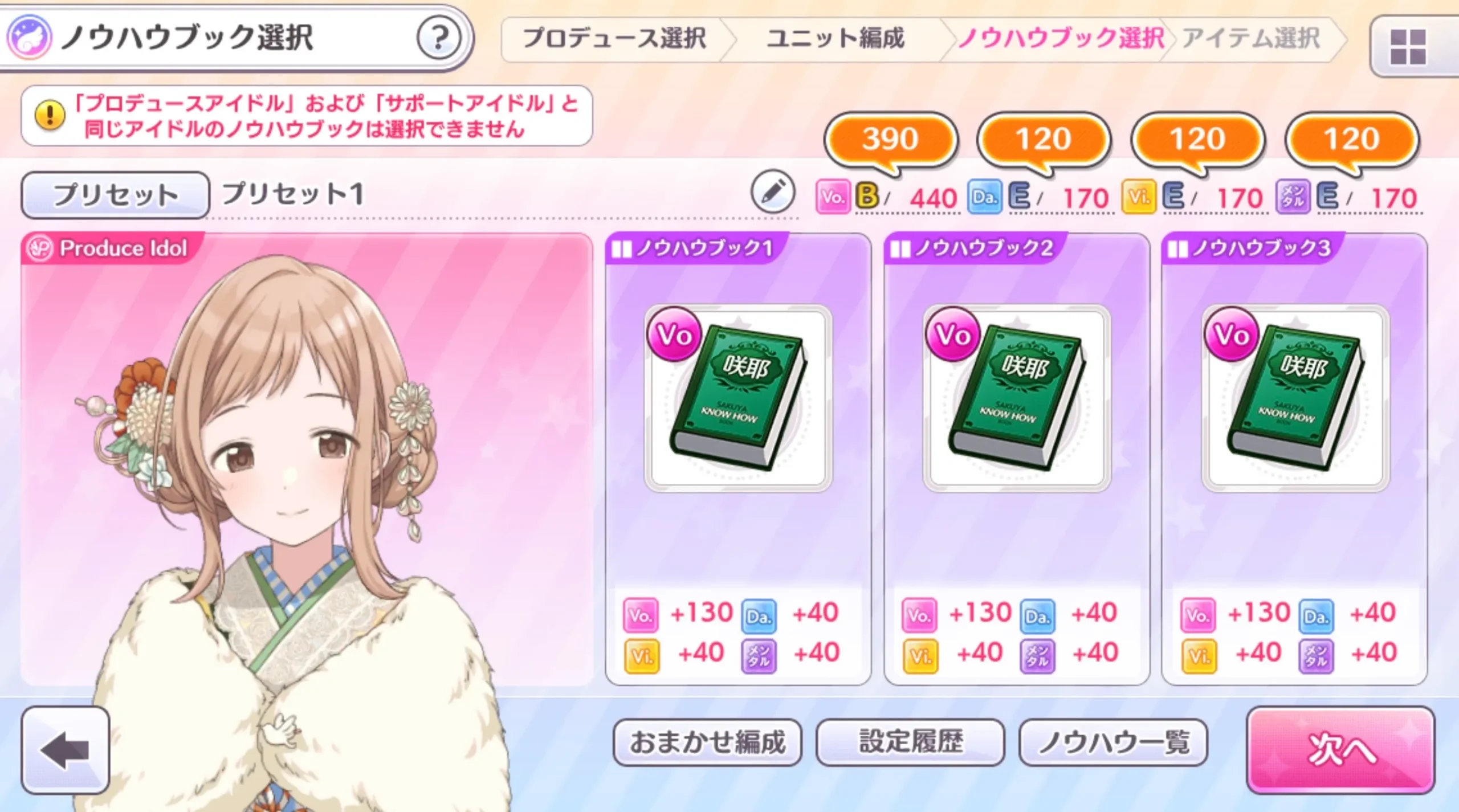 オートだけで済ますなら編成もだけどVo++とエキスパLv5とWINGノウハウつけたノウハウブック入ると思う