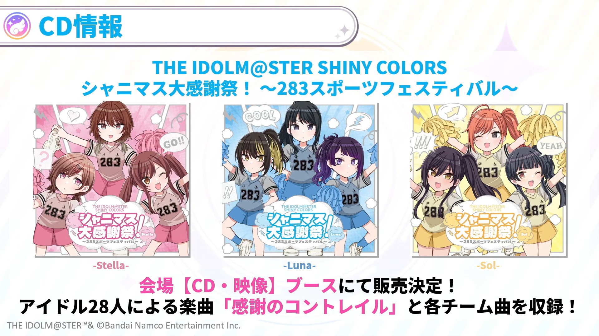 2月14日・15日に開催される「THE IDOLM@STER SHINY COLORS シャニマス大感謝祭! 〜283スポーツフェスティバル~」の会場にて会場限定のCD3種が販売されます。アイドル28人による楽曲「感謝のコントレイル」と各チーム曲が収録されています。