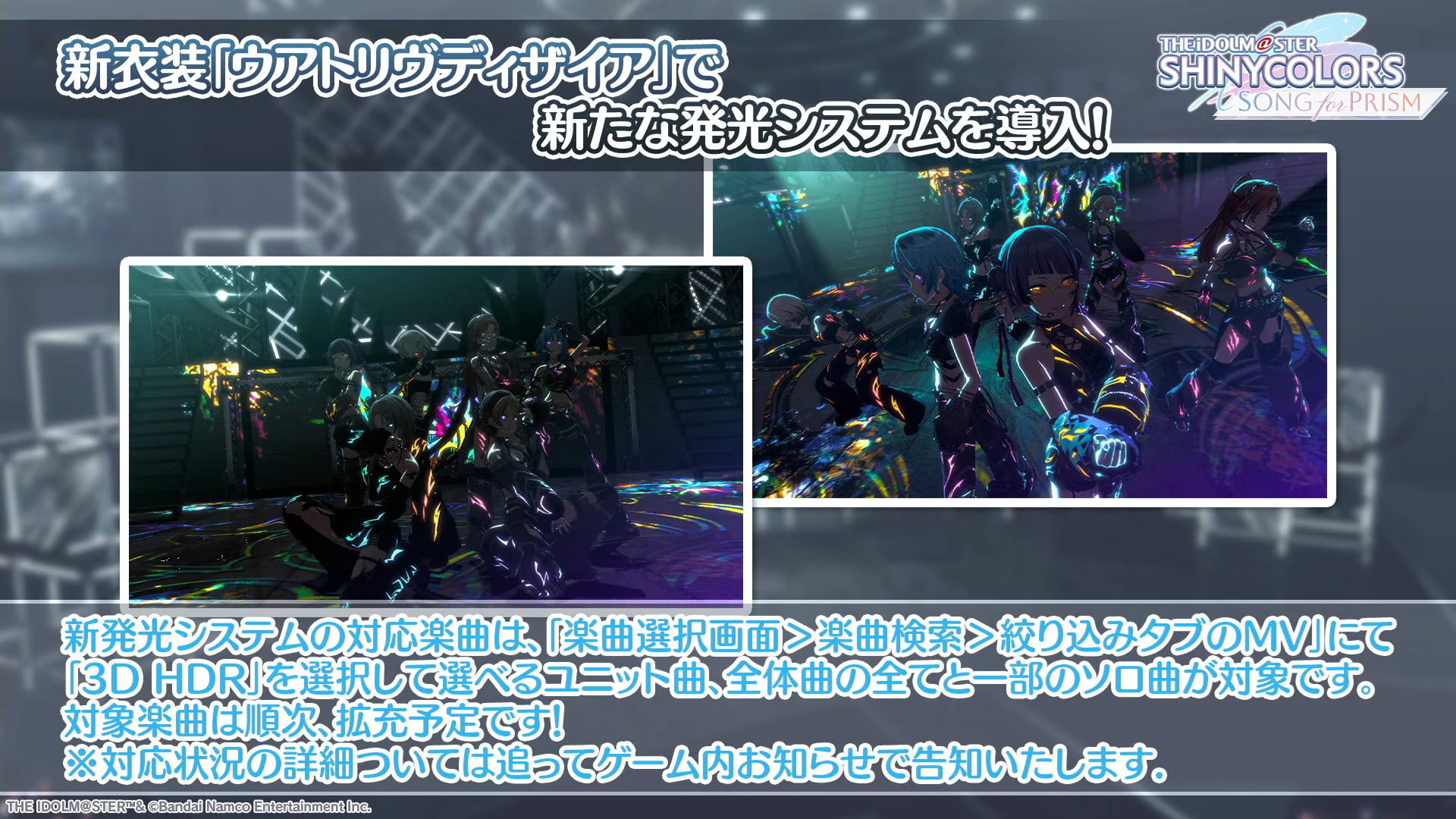 新ユニット衣装「ウアトリヴディザイア」の追加から新たな発光システムが導入されます。新発光システムの対応楽曲は絞り込みタブのMVにて「3D HDR」を選択して選べるユニット曲、全体曲の全てと一部のソロ曲が対象です。対象楽曲は順次拡充予定です。