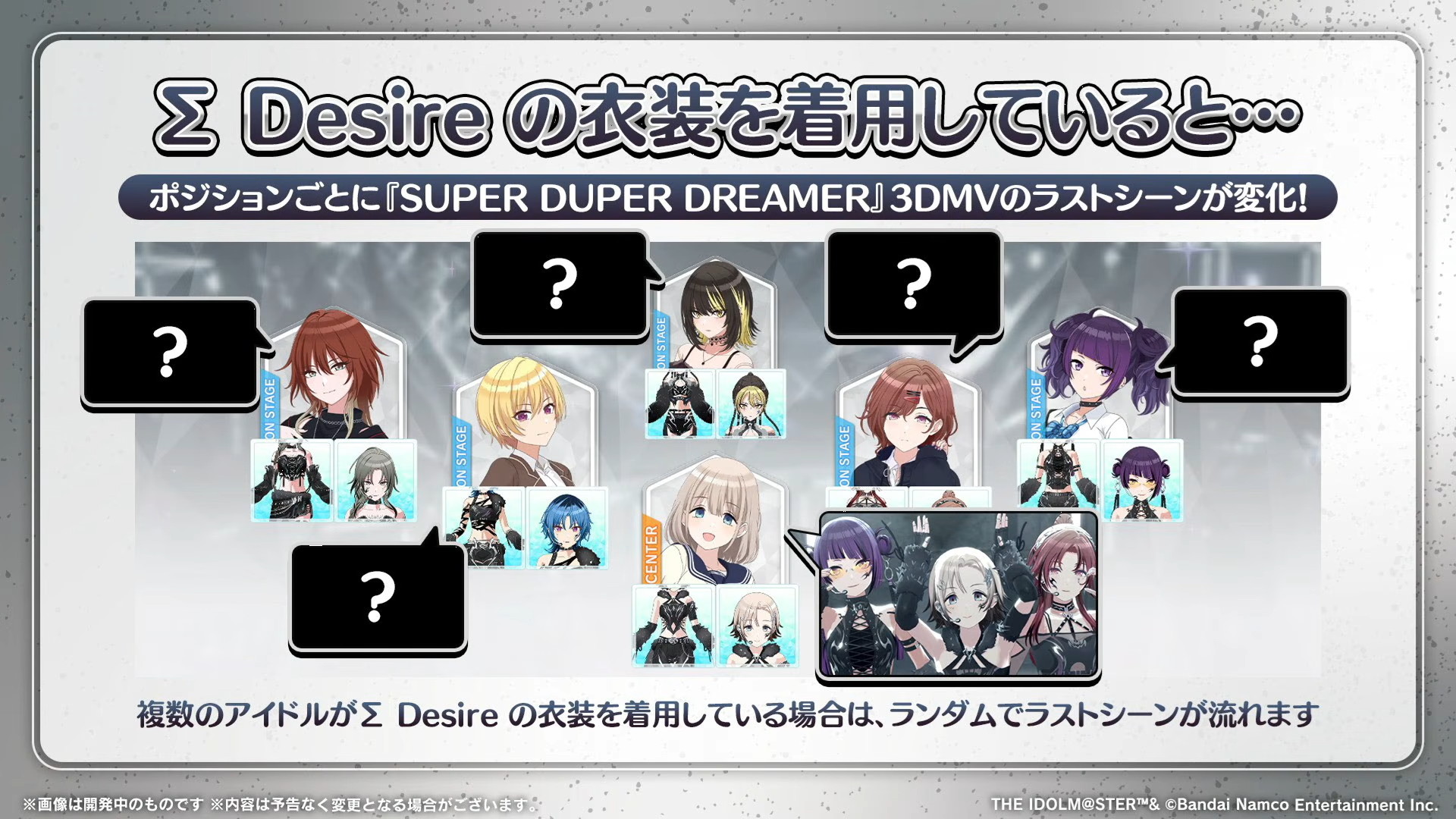 Σ Desireの衣装を着用しているとポジションごとに楽曲「SUPER DUPER DREAMER」3DMVのラストシーンが変化します。