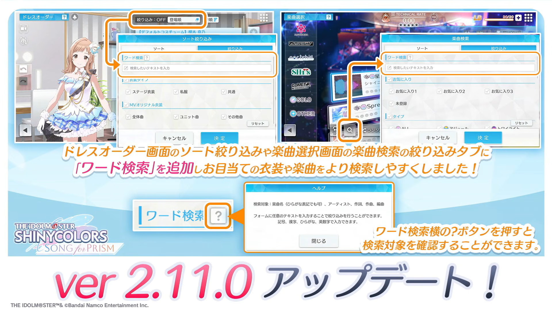 ver2.11.0アップデートとしてドレスオーダー画面のソート絞り込みや楽曲選択画面の楽曲検索の絞り込みタブに「ワード検索」が追加されます。