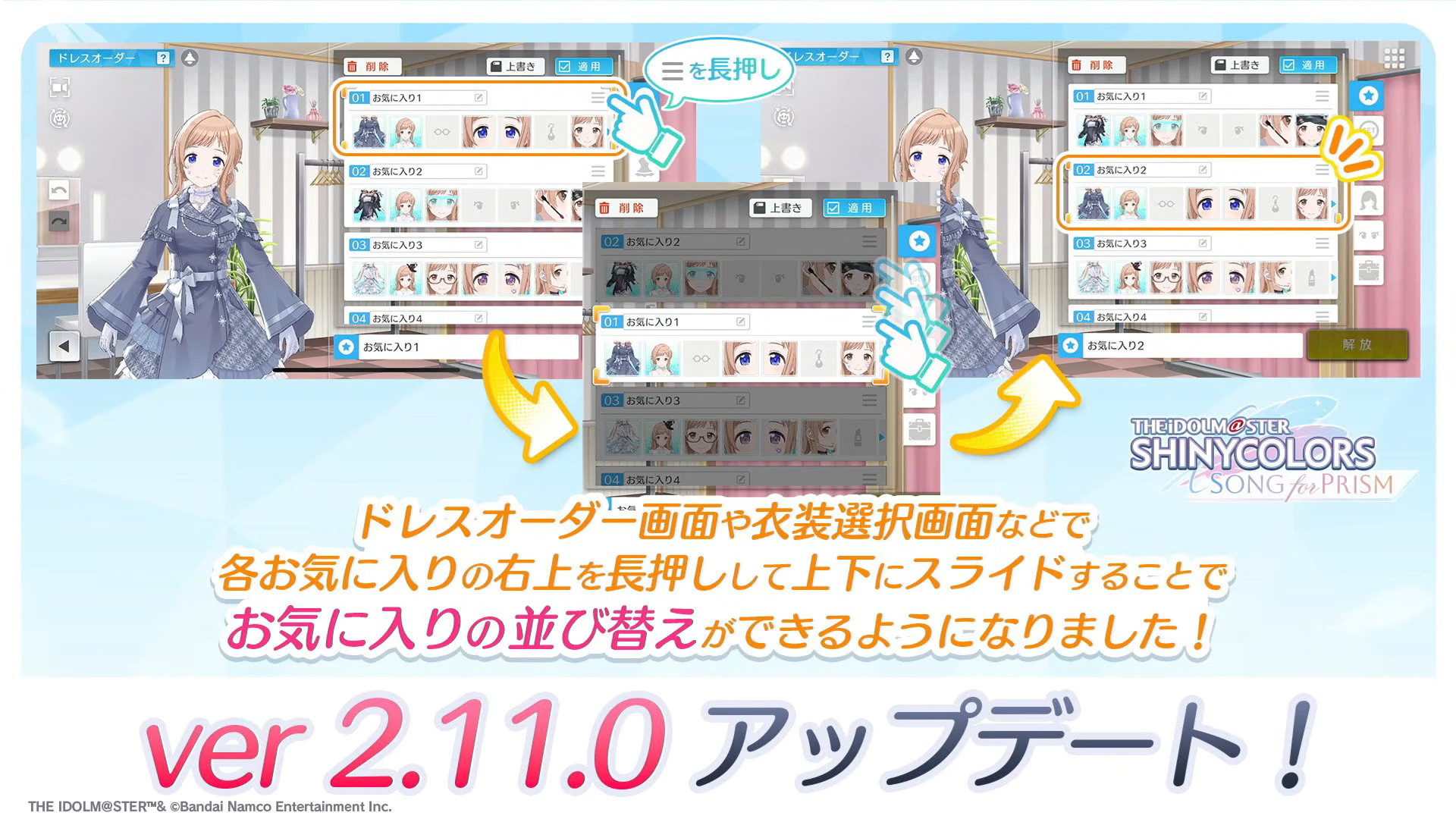 またドレスオーダー画面や衣装選択画面などで各お気に入りの右上を長押しして上下にスライドすることでお気に入りの並び替えができるようになります。
