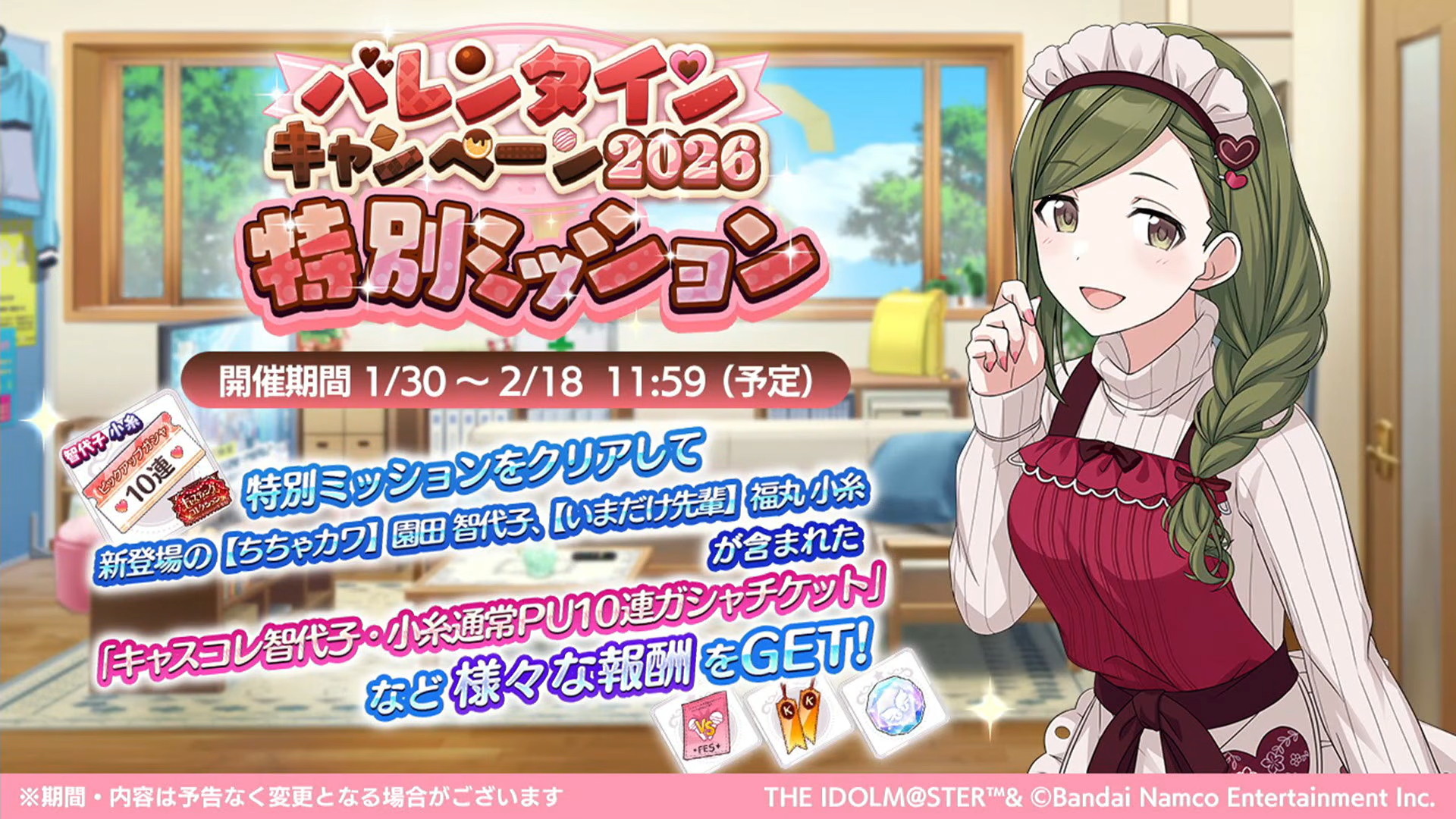 1月30日より「バレンタインキャンペーン2026特別ミッション」が開催されます。特別ミッションクリアでキャスコレ智代子・小糸通常PU10連ガシャチケットなど様々報酬を獲得できます。