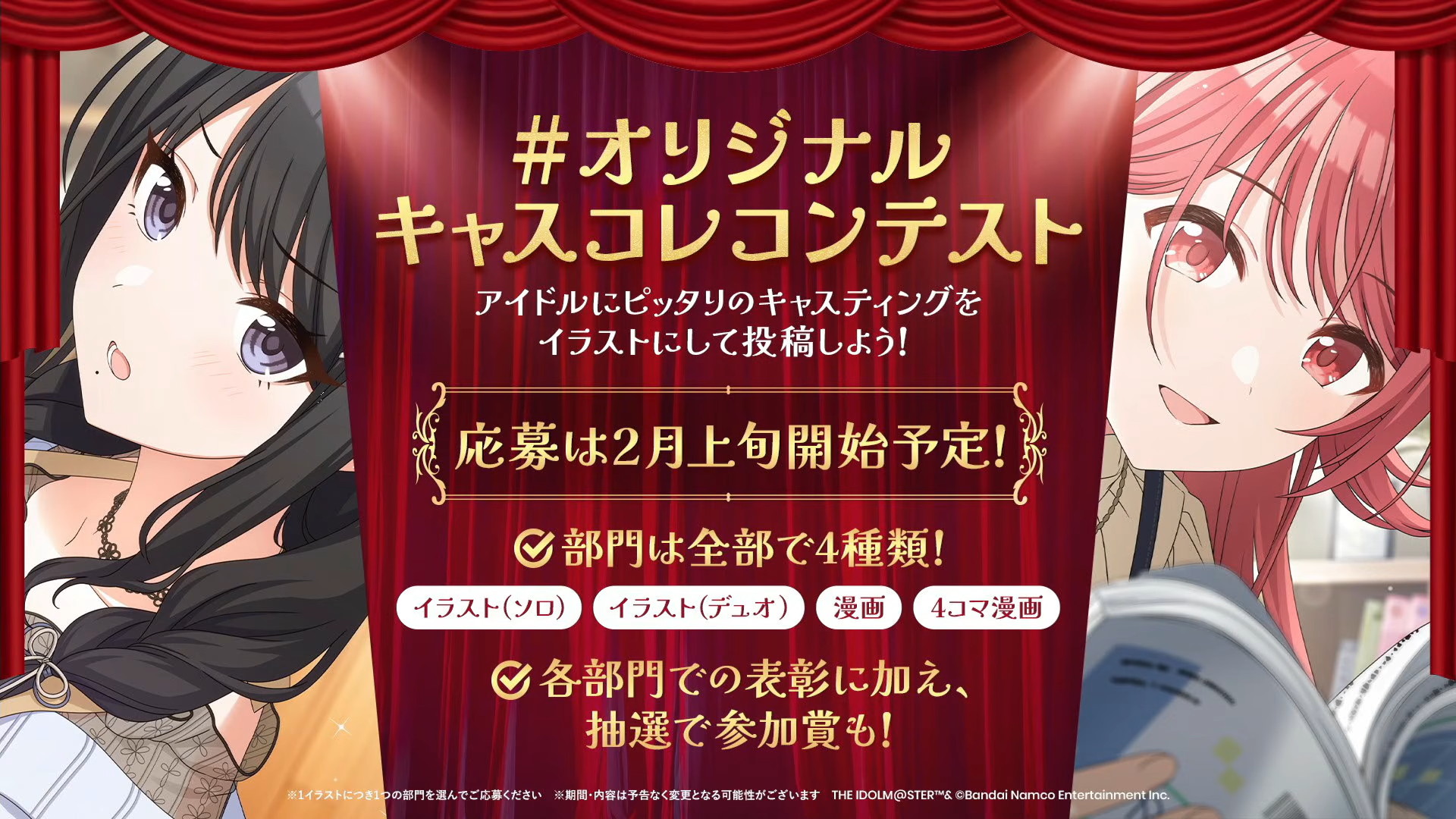 2月上旬よりXにて#オリジナルキャスコレコンテストが開催されます。アイドルにピッタリのキャスティングをイラストにして投稿するというもので部門はイラスト(ソロ)、イラスト(デュオ)、漫画、4コマ漫画の4種類。各部門での表彰に加えて抽選で参加賞も選ばれます。
