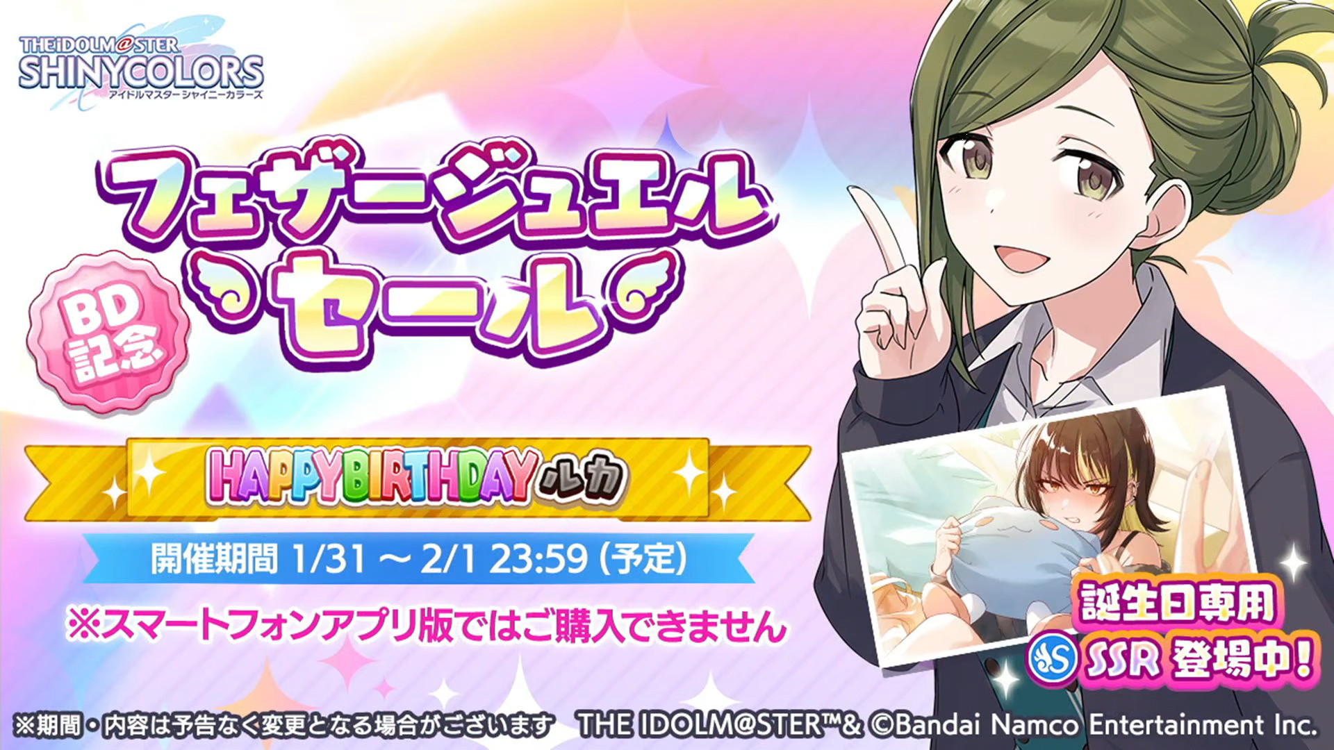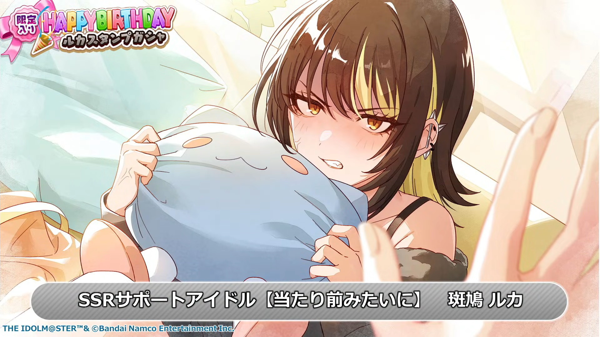 1月31日の斑鳩ルカの誕生日に「限定入り HAPPY BIRTHDAY ルカスタンプガシャ」が開催されます。誕生日限定SSRサポートアイドル斑鳩ルカが登場します。