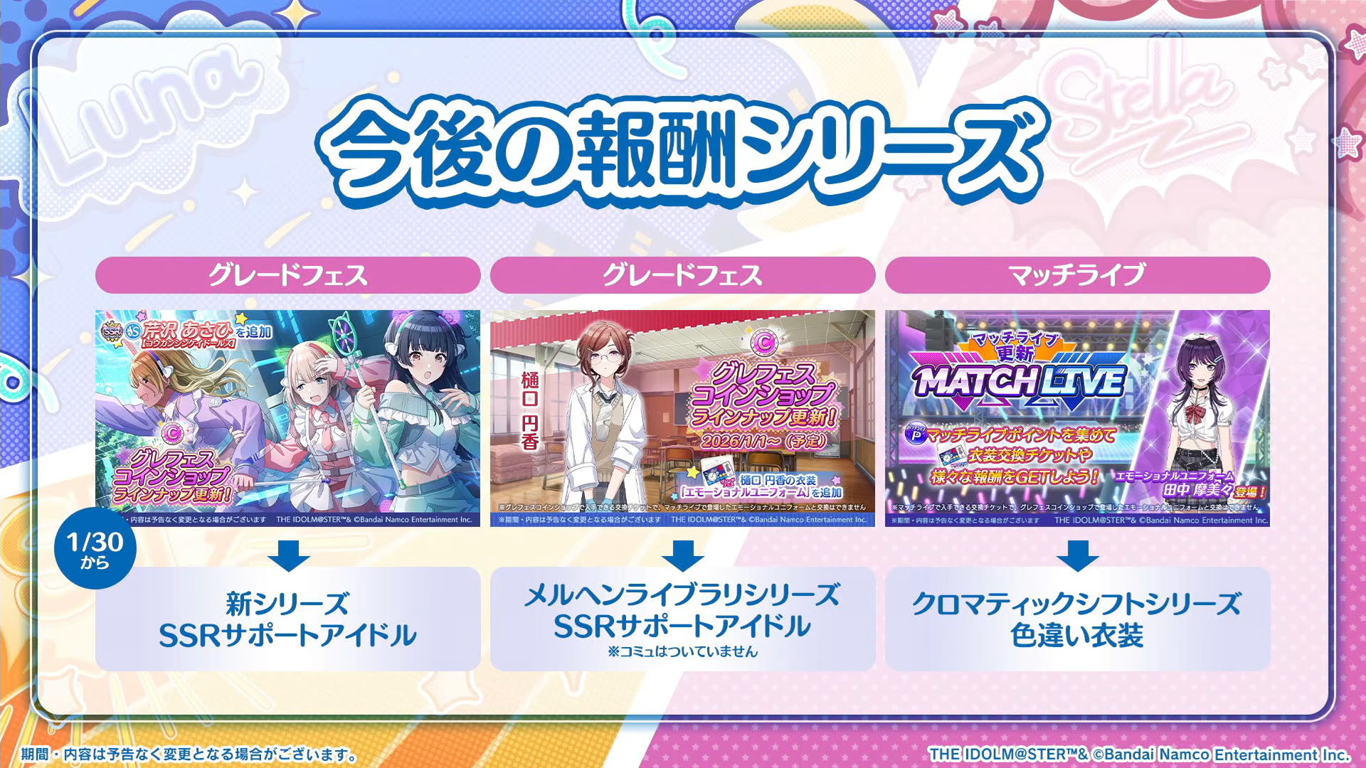 1月30日よりグレードフェス、マッチライブの報酬シリーズがそれぞれ新しいものに切り替わります。
