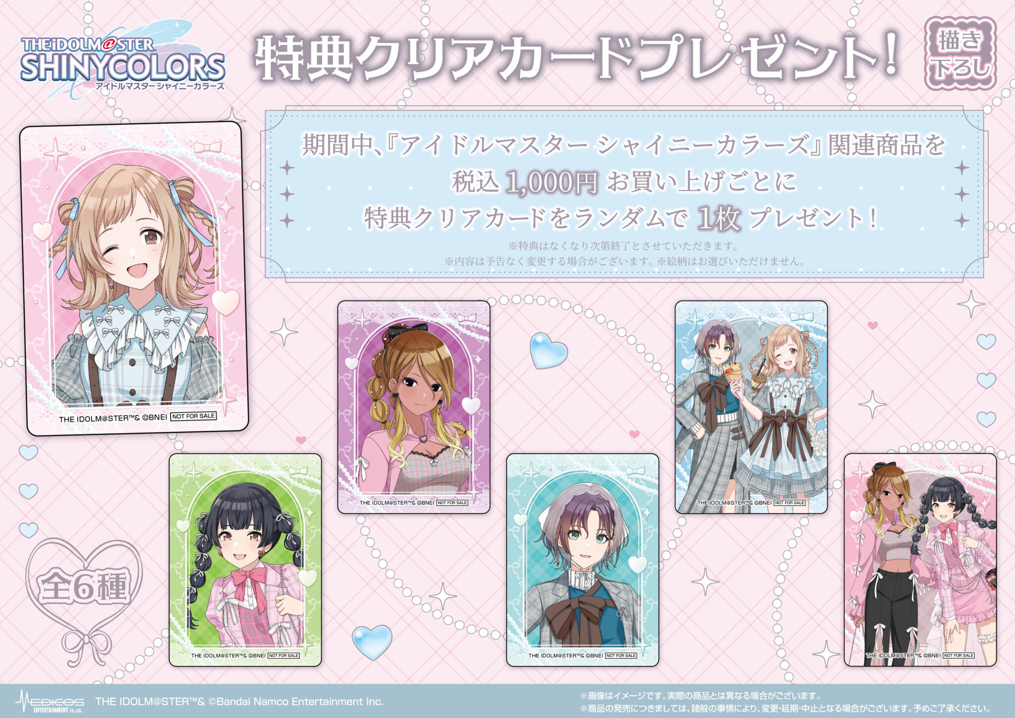 期間中、『アイドルマスター シャイニーカラーズ』関連商品を1,000円(税込)お買い上げごとに特典クリアカード(全6種)をランダムで1枚プレゼント!