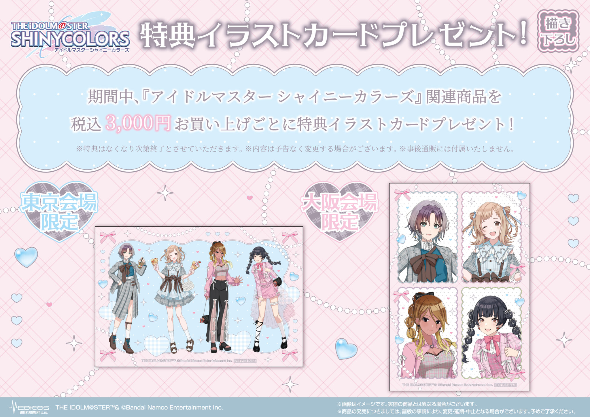 期間中、各会場にて『アイドルマスター シャイニーカラーズ』関連商品を3,000円(税込)お買い上げごとに各会場限定特典イラストカード(各1種)を1枚プレゼント!