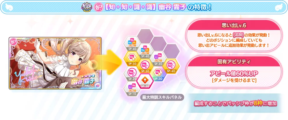 【知・知・識・識】幽谷 霧子の思い出アピールLv.6では、センターポジションの思い出アピールに「全観客にVocal1倍アピール」を追加することができます。