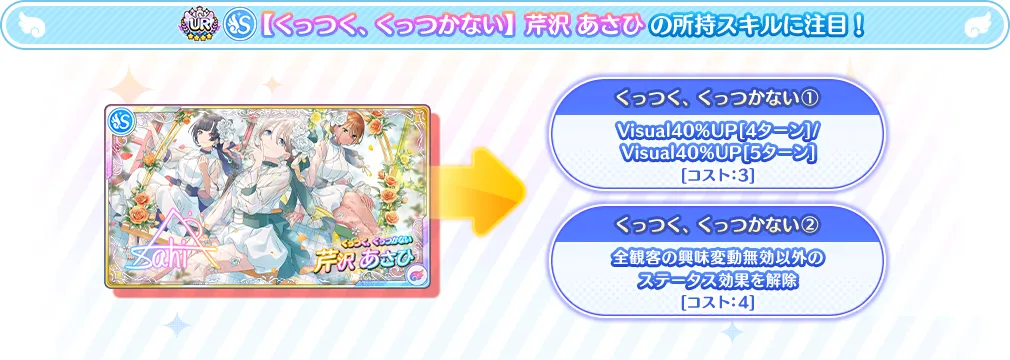 加入直後から習得可能なライブスキル「くっつく、くっつかない」はVisual4倍アピールを行い、気力+1の効果を発揮することができます。