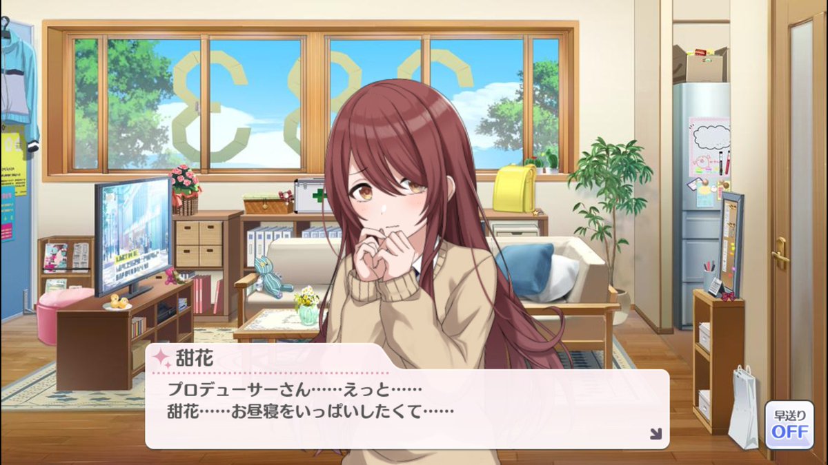 信頼度上げで歌姫周回してた時に、明らかに甜花ちゃんは休みの約束の頻度が異常すぎて笑った