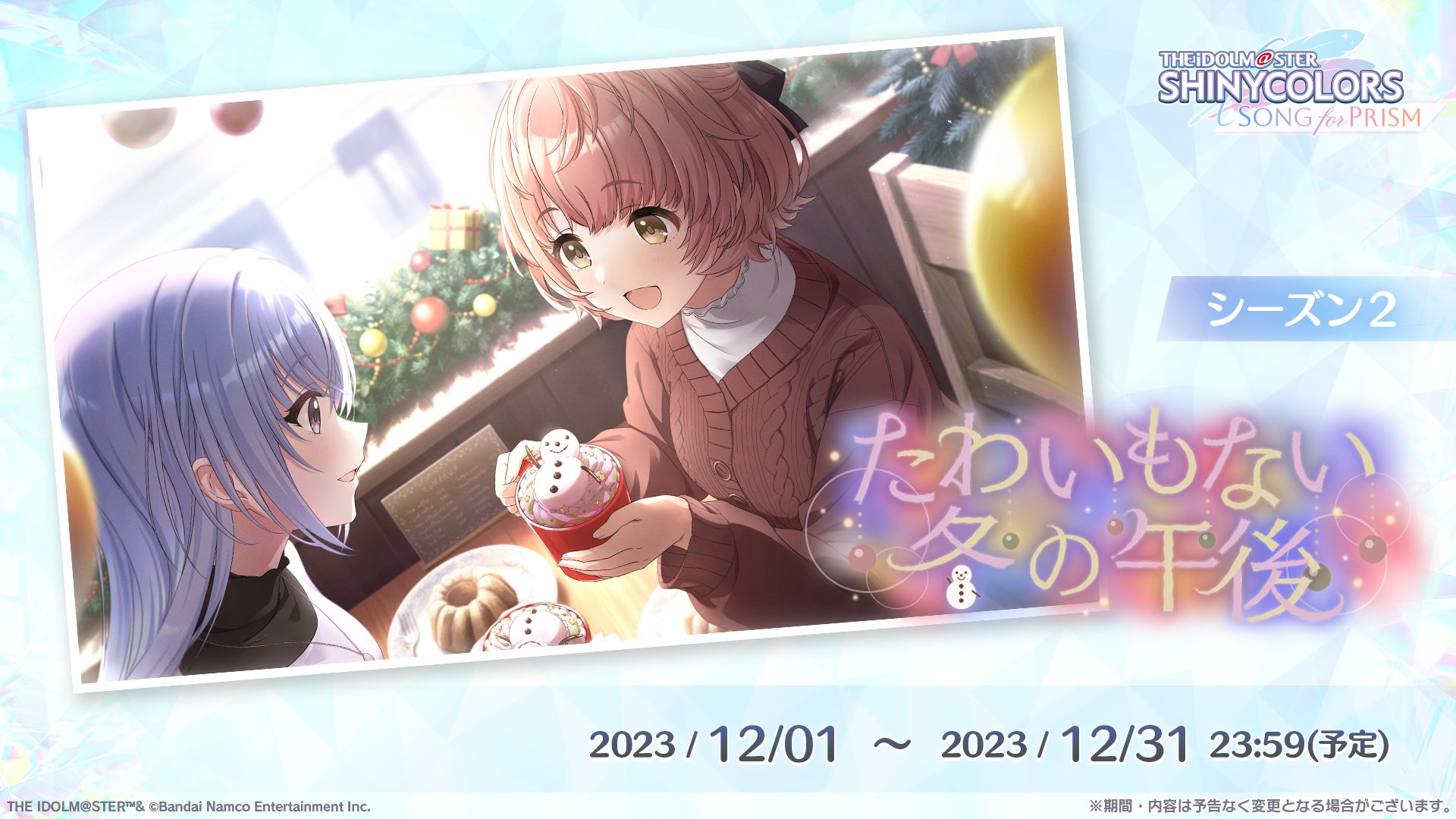 12月11日より羽那とはるきも登場する越境イベント「ロード・トゥ・ハッピーホリデー!」が開催予定です。報酬としてSSRサポートアイドル有栖川夏葉が登場します。