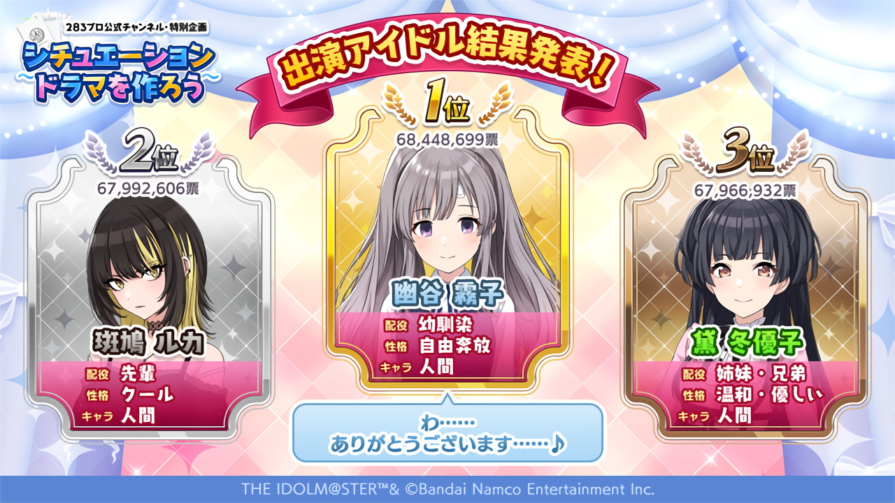 の結果発表です!この「シチュエーション」「役柄」「アイドル」が、どのような物語を紡ぐのか