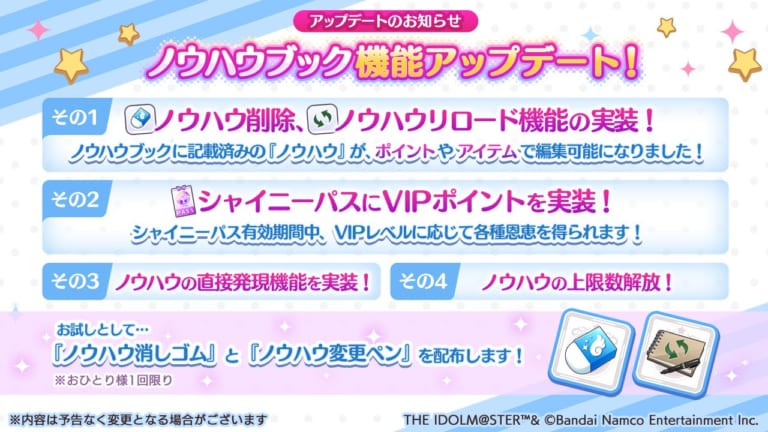 【シャニマス】ノウハウブック機能がアップデート!削除・リロード機能、シャイニーパスにVIPポイント、直接発現機能が実装&上限数解放