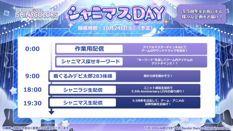 【シャニマス】10月24日のシャニマスDAYのタイムスケジュールが発表!生配信2つに作業用サントラ配信、着ぐるみデビ太郎283体操も