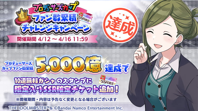 【シャニマス】プロデューサーズカップファン数累積チャレンジ達成で10連無料ガシャのスタンプに限定入りSSR確定チケットが追加!