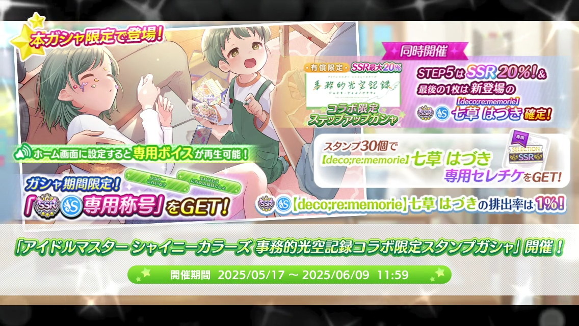 『アイドルマスター シャイニーカラーズ(シャニマス)』において、2025年5月17日より開催中の「アイドルマスター シャイニーカラーズ 事務的光空記録コラボ限定スタンプガシャ」についてご紹介します