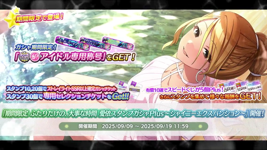 『アイドルマスター シャイニーカラーズ(シャニマス)』において、2025年9月9日より開催中の「期間限定 ふたりだけの、大事な時間 愛依スタンプガシャPlus〜シャイニーエクスパンション〜」についてご紹介します。