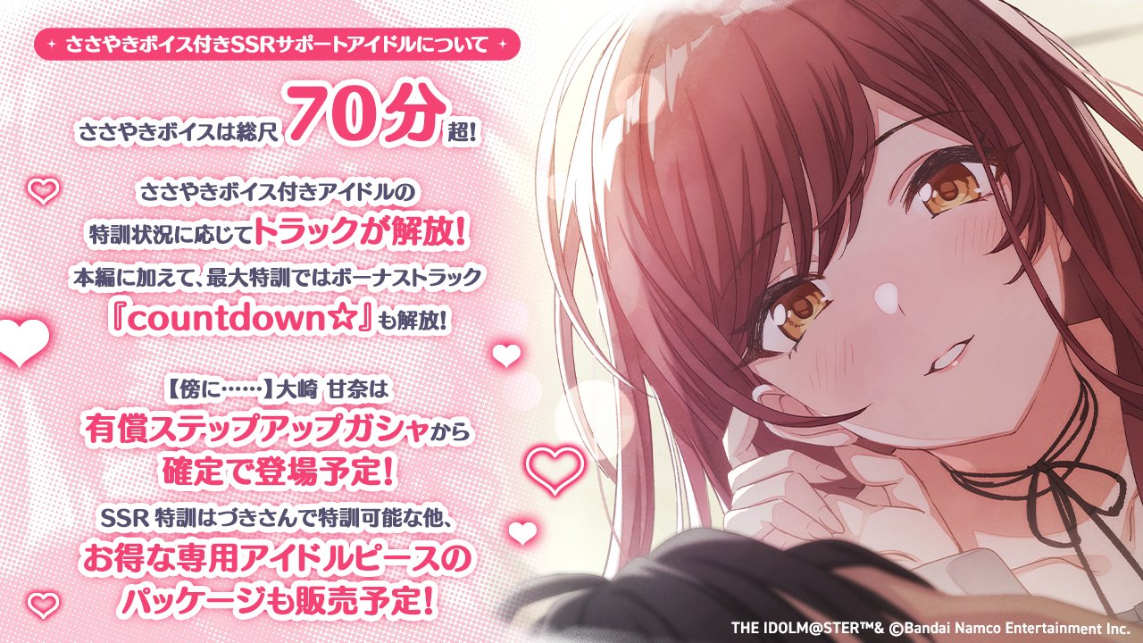 『アイドルマスター シャイニーカラーズ(シャニマス)』において、2025年8月20日より開催中の「有償限定 SSR最大20%!【傍に……】大崎 甘奈 ささやきボイス付きアイドルステップアップガシャ」についてご紹介します。