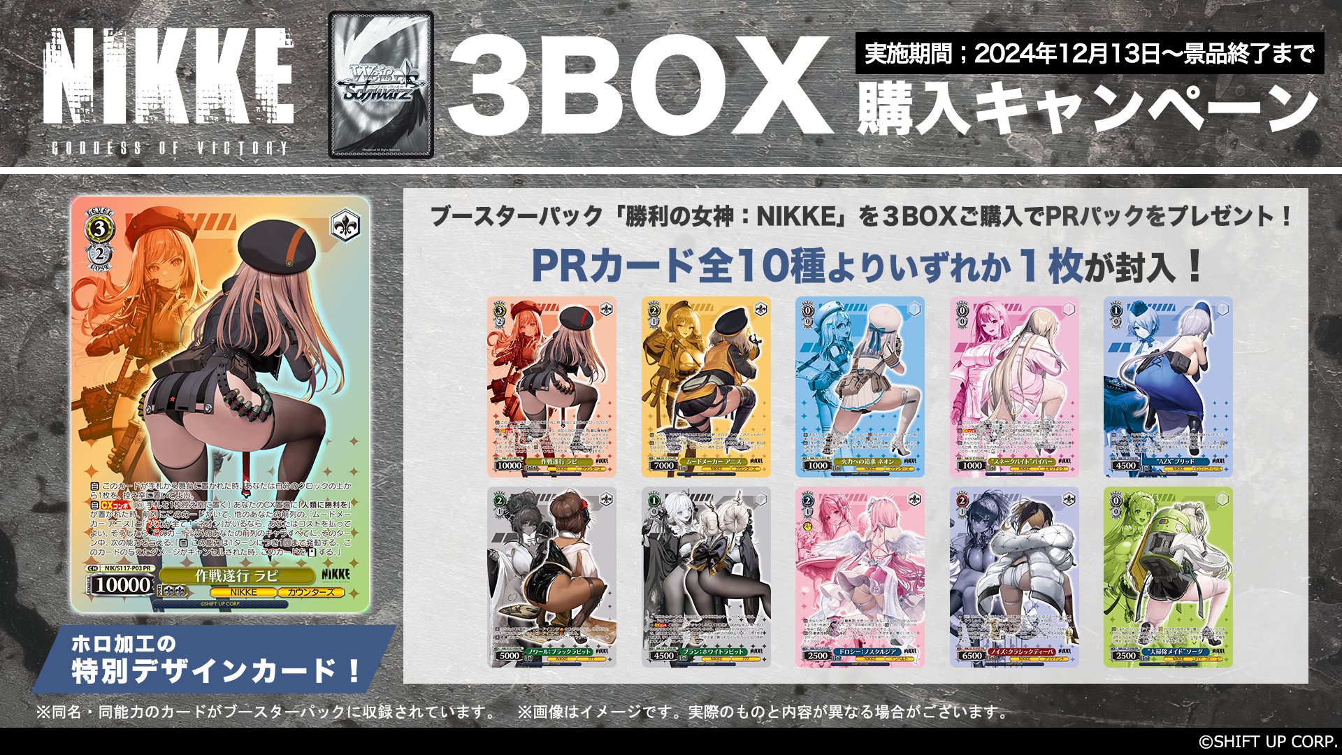 12月13日発売のブースターパック「勝利の女神:NIKKE」をヴァイスシュヴァルツ取扱店で3BOX購入すると、#WS PRパックをプレゼント!