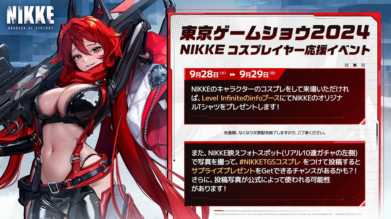 9月28日~29日限定❗ニケのコスプレでご来場いただいた指揮官様には、Level infiniteのinfoブースにて「オリジナルNIKKE Tシャツ」をプレゼントしちゃいます✨